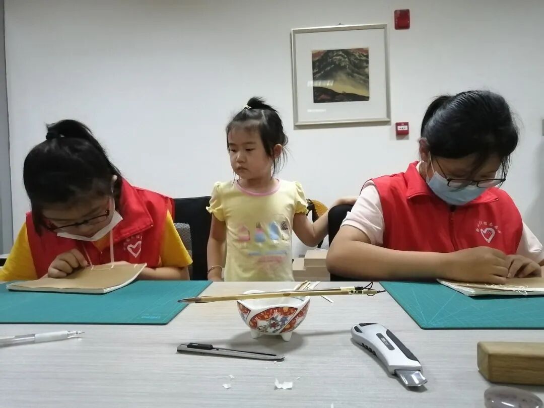 亲临其境的实践形式给小志愿者们带来了古代技艺的现场感,激发了他们的浓厚兴趣,不体验完全部过程不“善罢甘休”,大家通过亲自动手操作体验,初步掌握了线装书制作的技艺,明白了过程的艰辛,同时也领悟了古代做书人的智慧,在投入和专注中体会到了快乐。