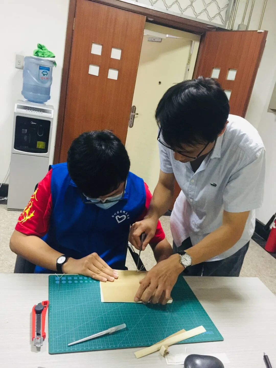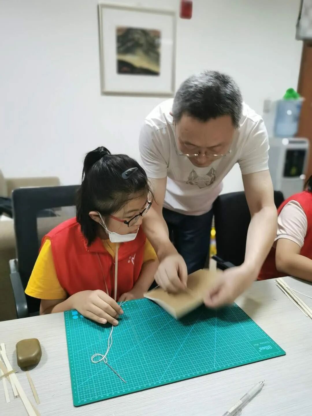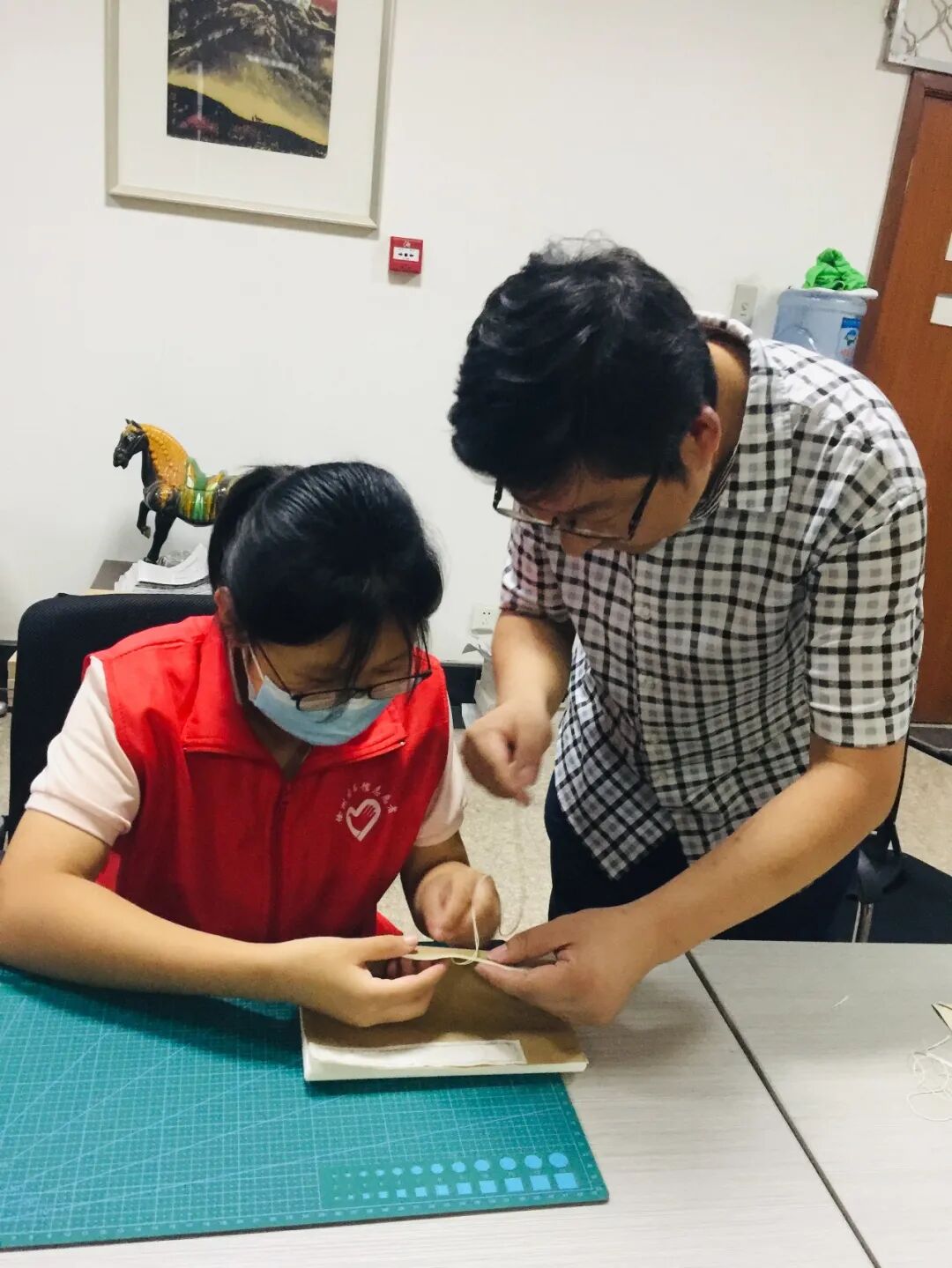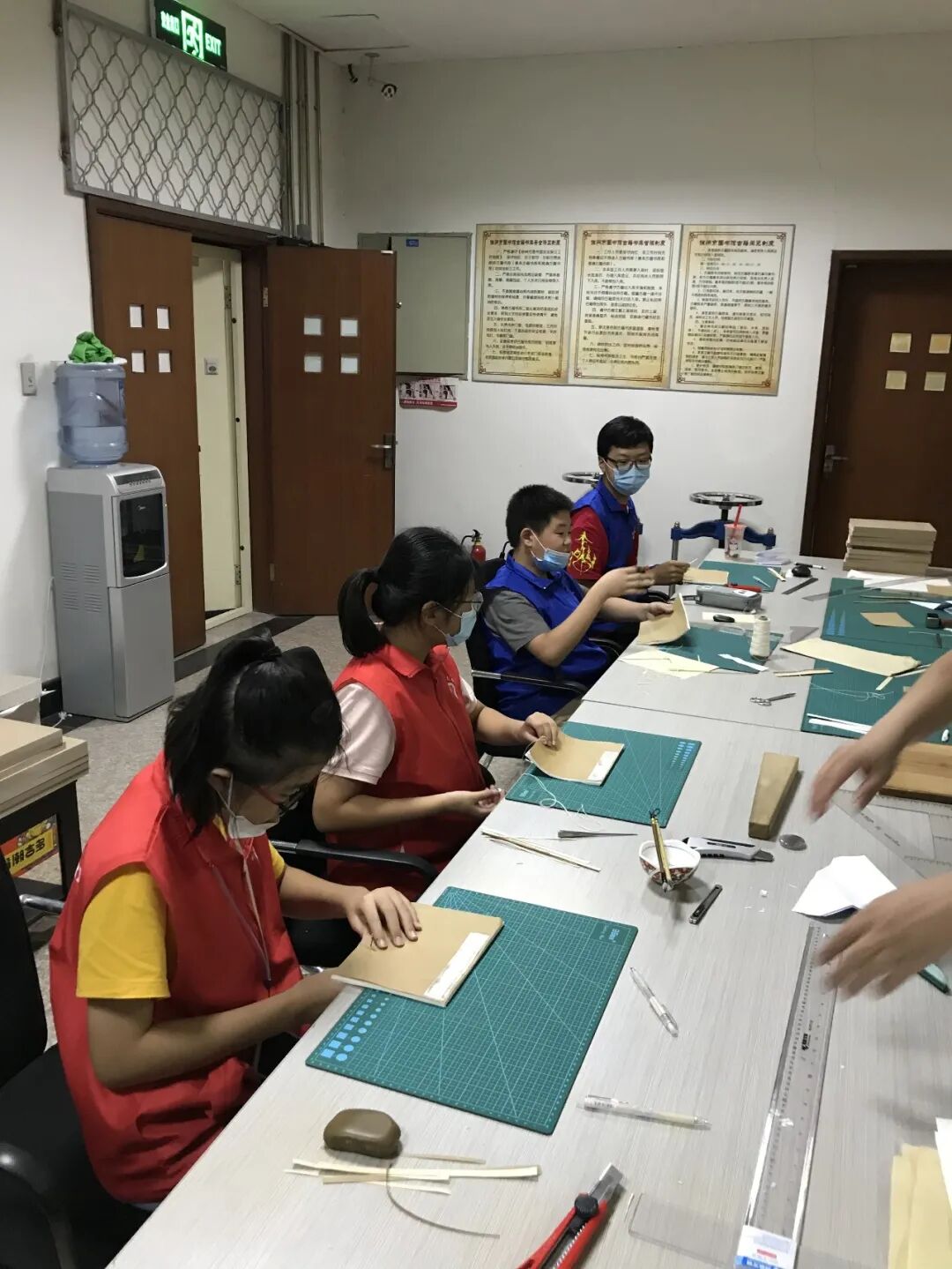 在三楼历史文献部活动现场,图书馆古籍修复人员向来自撷秀中学的小志愿者们介绍了古籍线装书制作的方法、原理,展示了制作过程中所需要的传统工具,介绍了它们的名字、用途。在古籍修复人员的示范带领和指导下,小志愿者们使用传统工具、严格按照传统古法开展每一个流程的制作活动,对纸、用针锥定点、裁纸、打孔、捻纸钉、穿定纸钉、装书皮、打书眼、穿线、贴书签,老师们指导的认真,志愿者们做的投入。有的志愿者胆大心细,敢想敢做,不断发现和提出问题;有的志愿者慢工出细活,对每个环节精益求精;有的志愿者则先观察、后思考、再动手,做起事来有条有理,在同一种实践中展示出不同的性格。